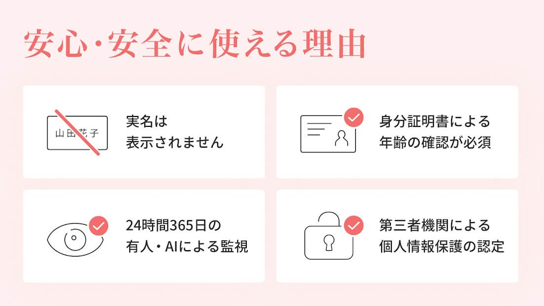 監視体制がしっかりしていて援デリ業者やパパ活目的の女性が少ないので安心できます。30代以上しか登録できなく年齢確認も必要なので安心して使うことが出来ています。