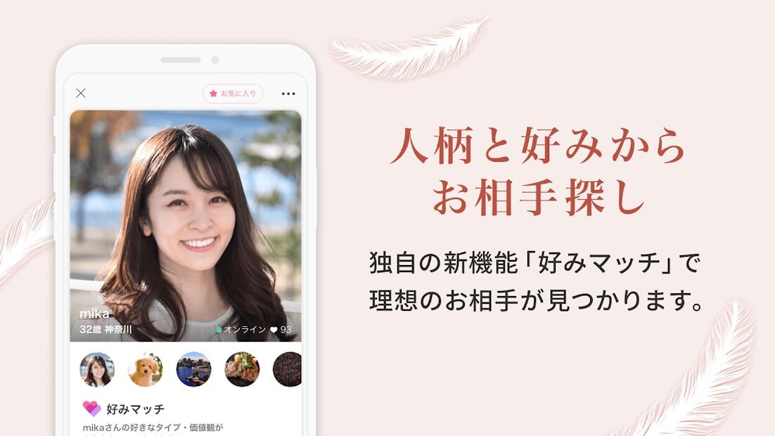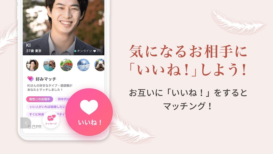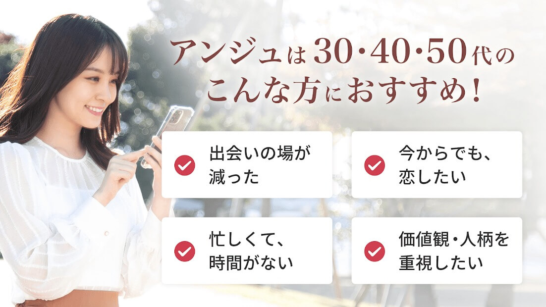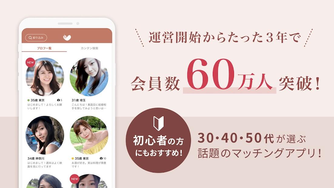 これからパートナー探しをはじめようと考えている30代、40代、50代の方へ、大人世代の方のみを対象とした恋活・婚活アプリ。真剣に将来を考えられる年代同士だからこそ、本気で相手に向き合うことが出来ます。AIによる自動監視システムで不正業者や不適切ユーザーを徹底排除しているため、男女ともに安心して利用できる婚活・恋活マッチングアプリです。