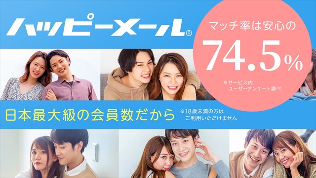 マッチングアプリは大手や中堅どころなど色々試してきましたが、なんだかんだハッピーメールに落ち着きます。ユーザー数も多く40代の自分でも20代の若い子と出会えたりして最高ですね。