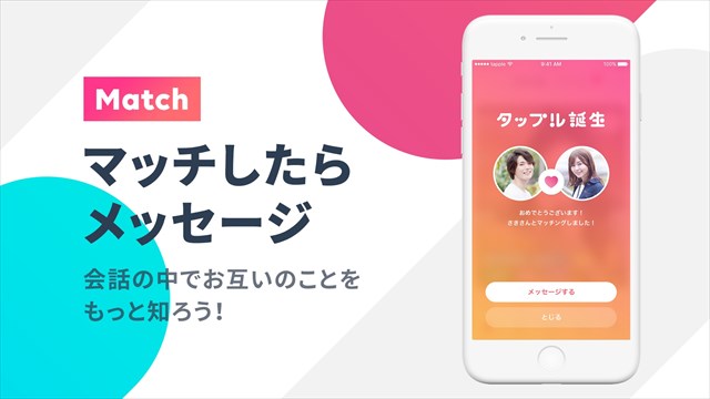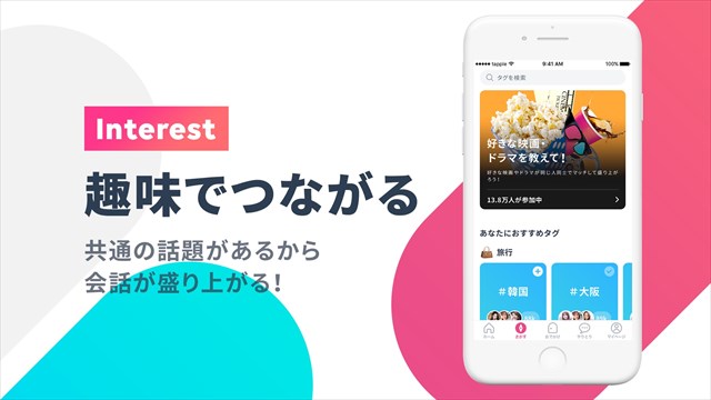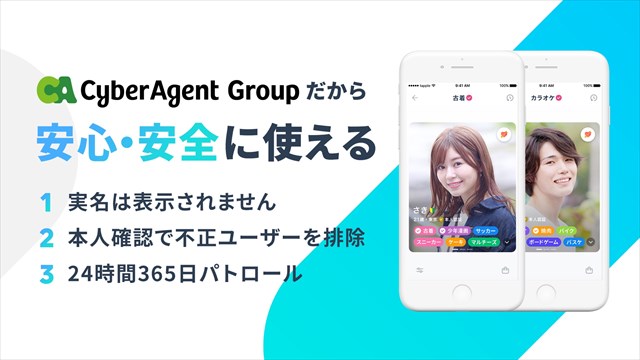 AbemaTVなどでお馴染みの大手企業のサイバーエージェントグループが運営する「やりたいことや行きたい場所」で繋がる恋活マッチングアプリ。音楽やファッションなどの自身の興味のあるカテゴリをタップすると共通の趣味を持った相手が表示され、気になる相手の写真を左右にスワイプするだけで出会いのきっかけが作れるのが特徴です。24時間365日、安心安全の監視体制・悪質業者対策も徹底しており、安心な出会い・恋活をサポートしてくれます。